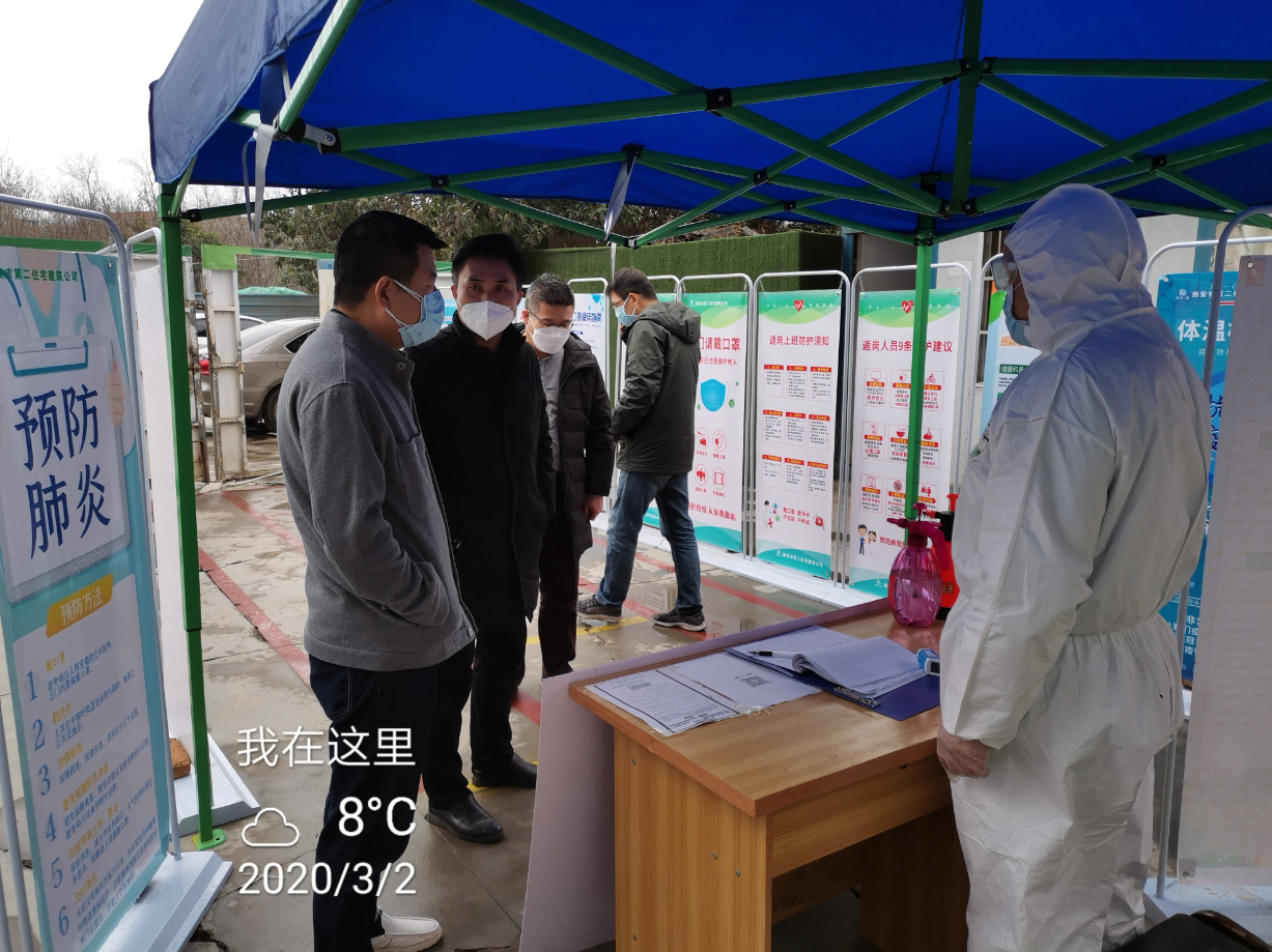 3月2日上午市住建局保障處處長王煒鵬同志到丈八保障房項目部實地檢查項目復工復產和疫情防控工作部署情況。西安市房地產經營二公司黨委副書記王備戰同志、西安市第二住宅建筑公司黨委書記吳高祥等同志陪同。
