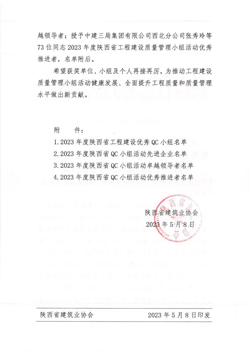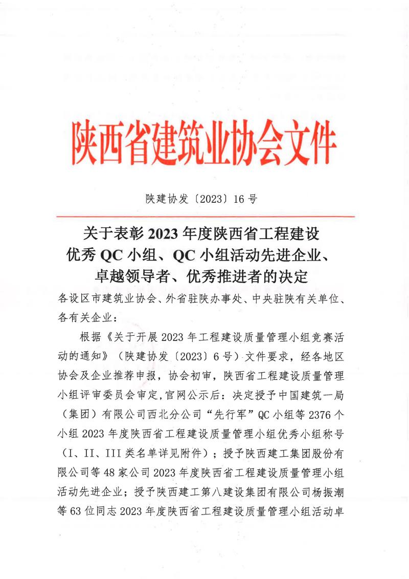 近期,在陜西省建筑業協會2023年QC成果評審中,港務中路項目QC小組《切割機擋火、降塵、水過濾系統的研制與應用》榮獲二類成果獎。今后我們將繼續努力,再接再厲,爭取拿到更多成果獎項,為提升工程質量貢獻一份住總力量。