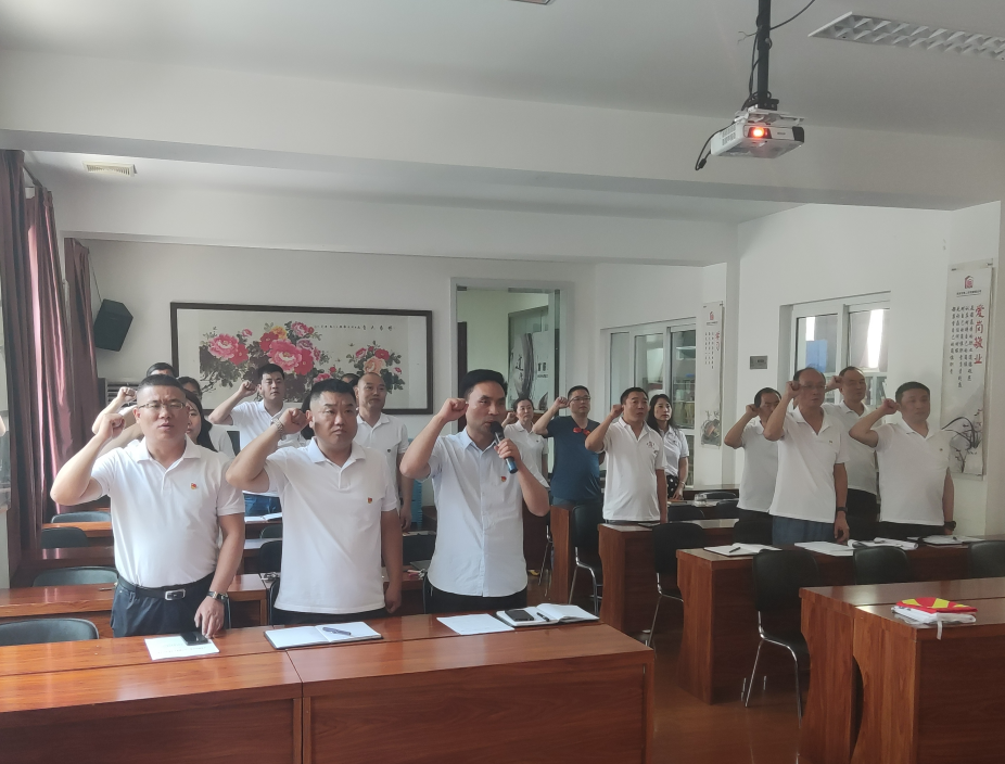 會議在雄壯的國際歌聲中開始。公司黨委書記吳高祥、副經理杜軍、紀委書記尚進出席會議。隨后在黨委書記吳高祥同志的帶領下全體黨員面對鮮紅的黨旗,重溫了入黨誓詞。