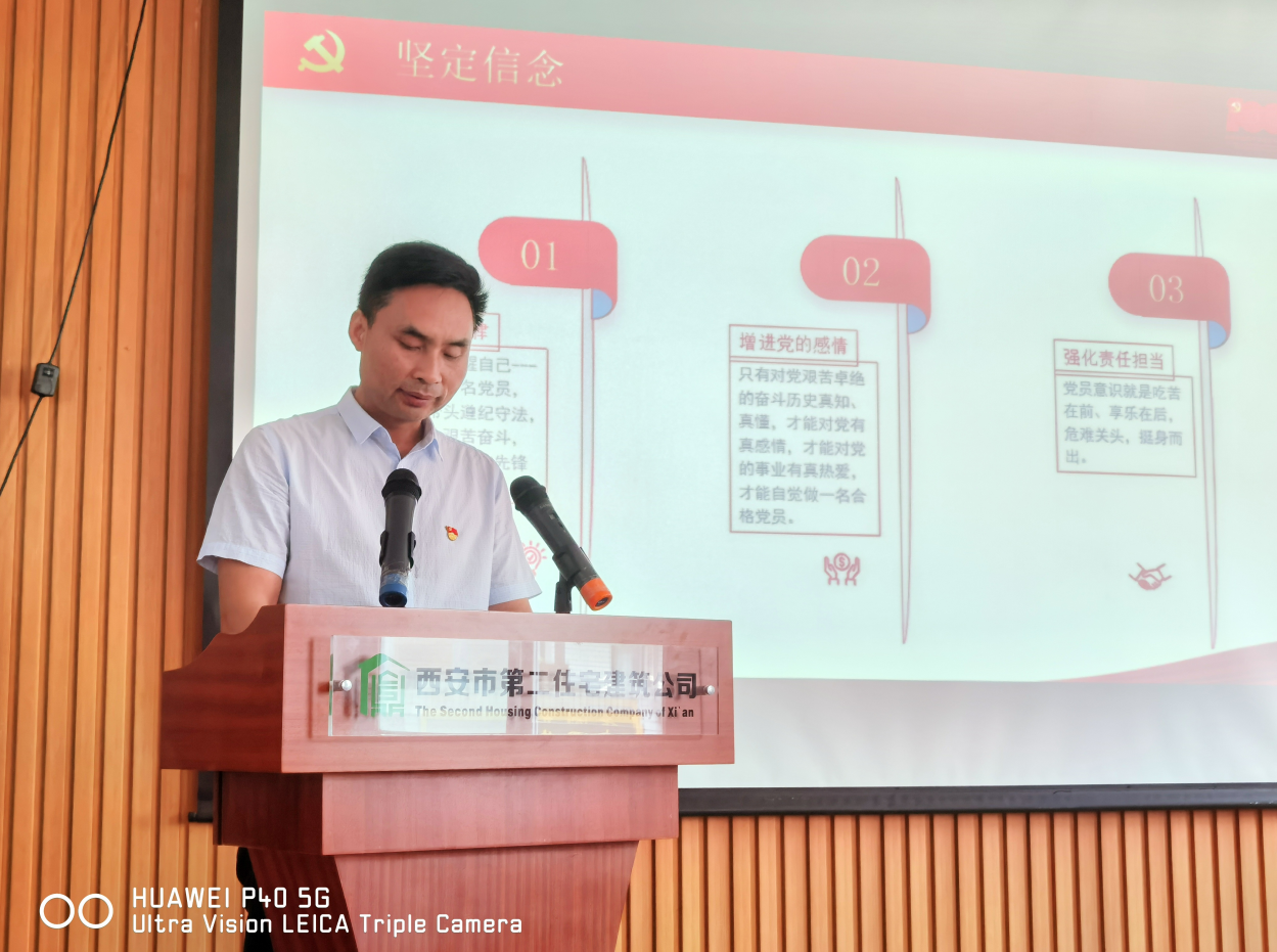 黨委書記吳高祥同志在黨課中要求,一要緬懷光榮歷史,汲取砥礪前行的強大精神力量。各基層黨組織要開展好黨史學習教育,切實做到學史明理、學史增信、學史崇德、學史力行,不斷增強使命意識和責任擔當,不斷在各項工作中走在前列、做出表率、勇爭第一。二要強化黨員教育,提升基層黨組織的凝聚力、戰斗力。要不斷強化黨員的身份、責任、服務、政治“四種意識”,落實基層黨建工作責任制,創新黨建工作思路,不斷提升黨員的政治素養,發揮好基層黨組織的戰斗堡壘作用。三要敢于擔當作為,譜寫住宅二建發展的嶄新篇章。要深刻把握“學史力行,實干為民”的核心要求,持續改進工作作風,以更高的標準、更嚴的要求、更實的舉措做好城市精細化管理工作。