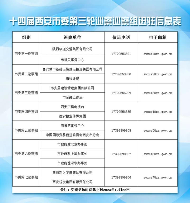 經市委批準,十四屆市委第三輪巡察共成立7個巡察組,分別對陜西軌道交通集團有限公司、市統計局、市金融工作局、市機關事務中心、市博覽事務中心、西安報業傳媒集團、西安廣播電視臺、中國國際貿易促進委員會西安市分會、西安城市基礎設施建設投資集團有限公司、市安居建設管理集團有限公司、市政府駐北京辦事處、市政府駐上海辦事處、市政府駐深圳辦事處等13家單位開展常規巡察,對西咸新區發展集團有限公司、西安經發集團有限責任公司2家單位開展提級巡察。